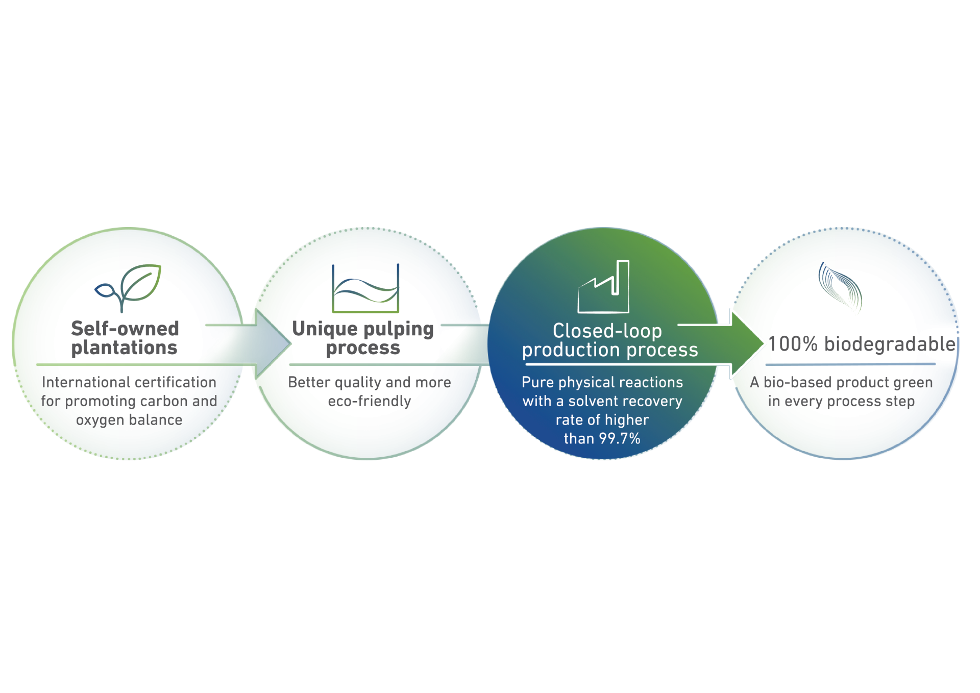 Sateri produces lyocell with closed-loop technology. In this efficient system, the organic solvent used to dissolve the wood pulp is recovered and continuously recycled at a rate of 99.7%, minimising waste and environmental impact.